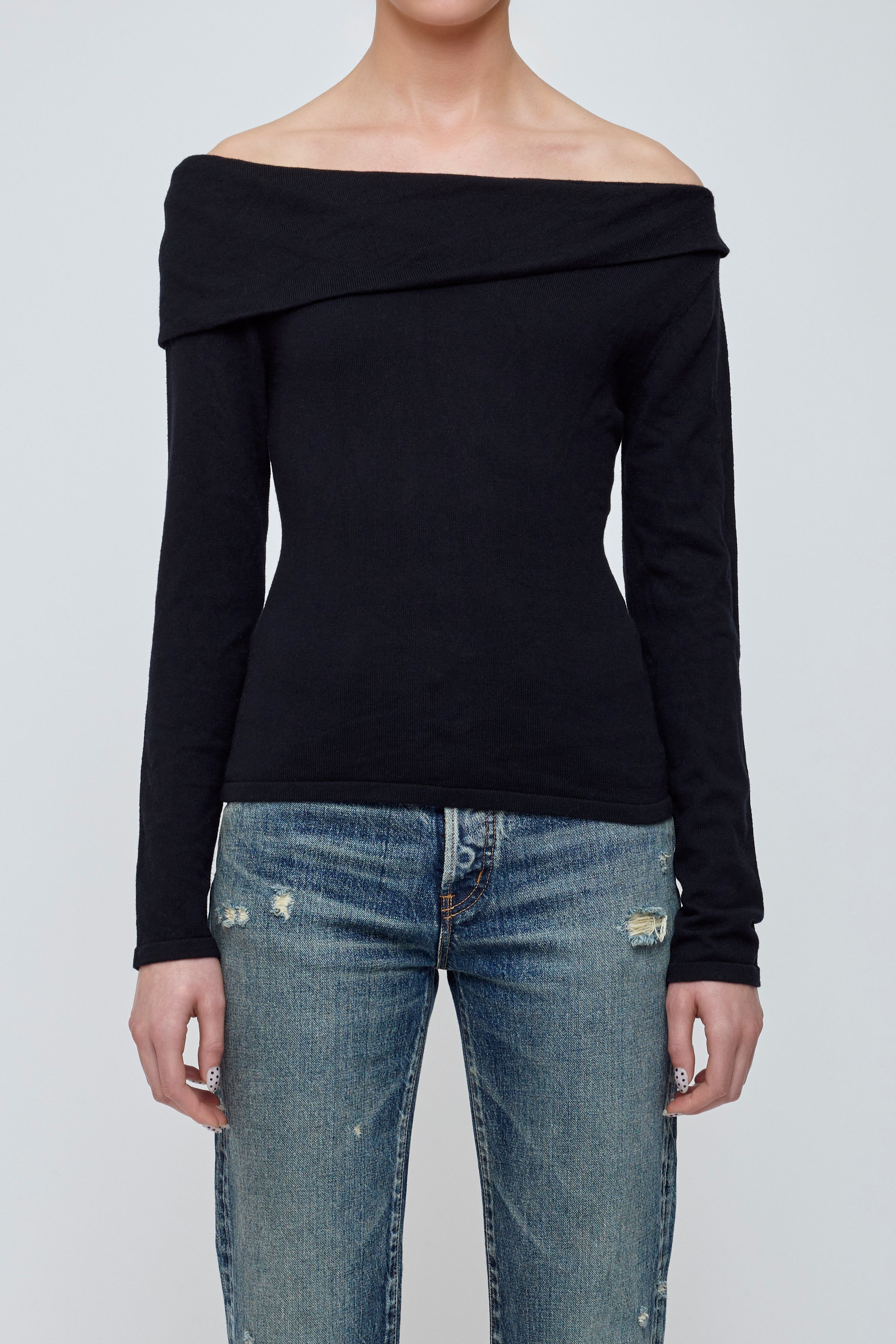 • A refined wool-blend sweater featuring a graceful off-shoulder neckline and a sleek silhouette.