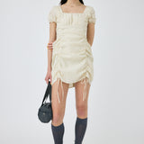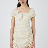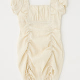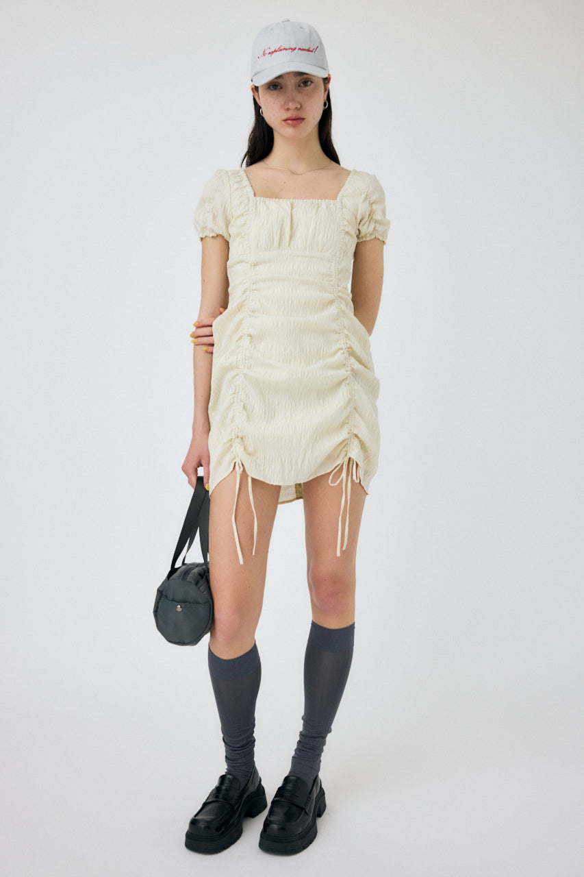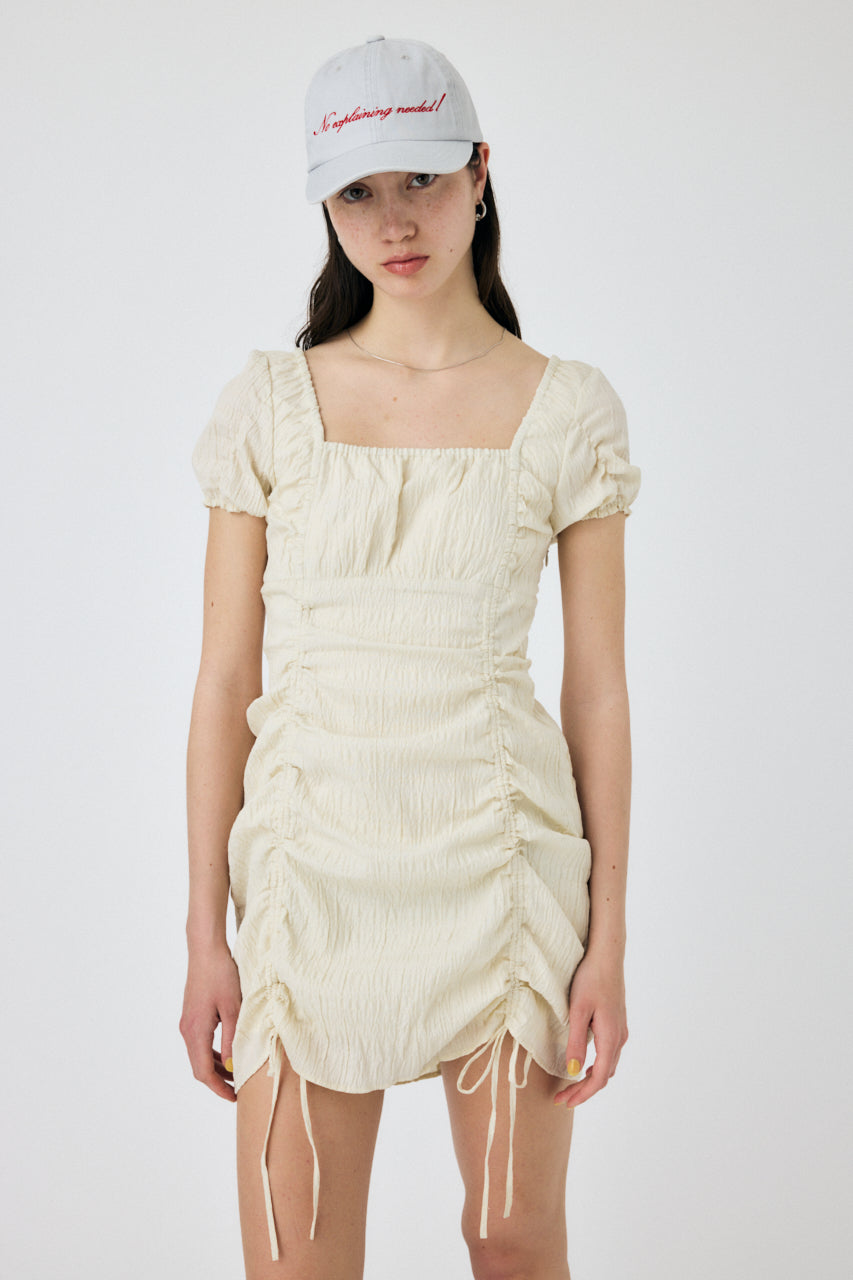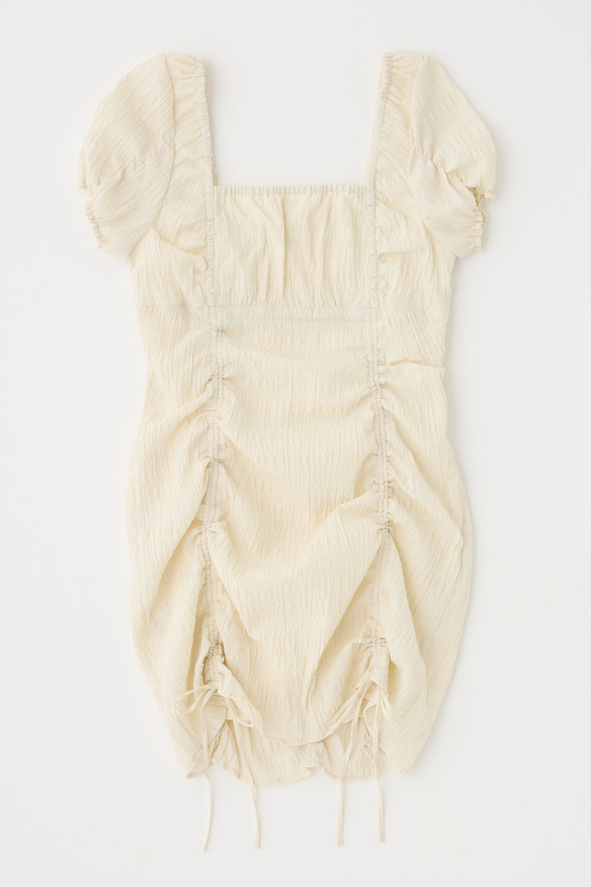 • A gathered dress with a softly crinkled texture and delicate ribbon details for a feminine touch.
