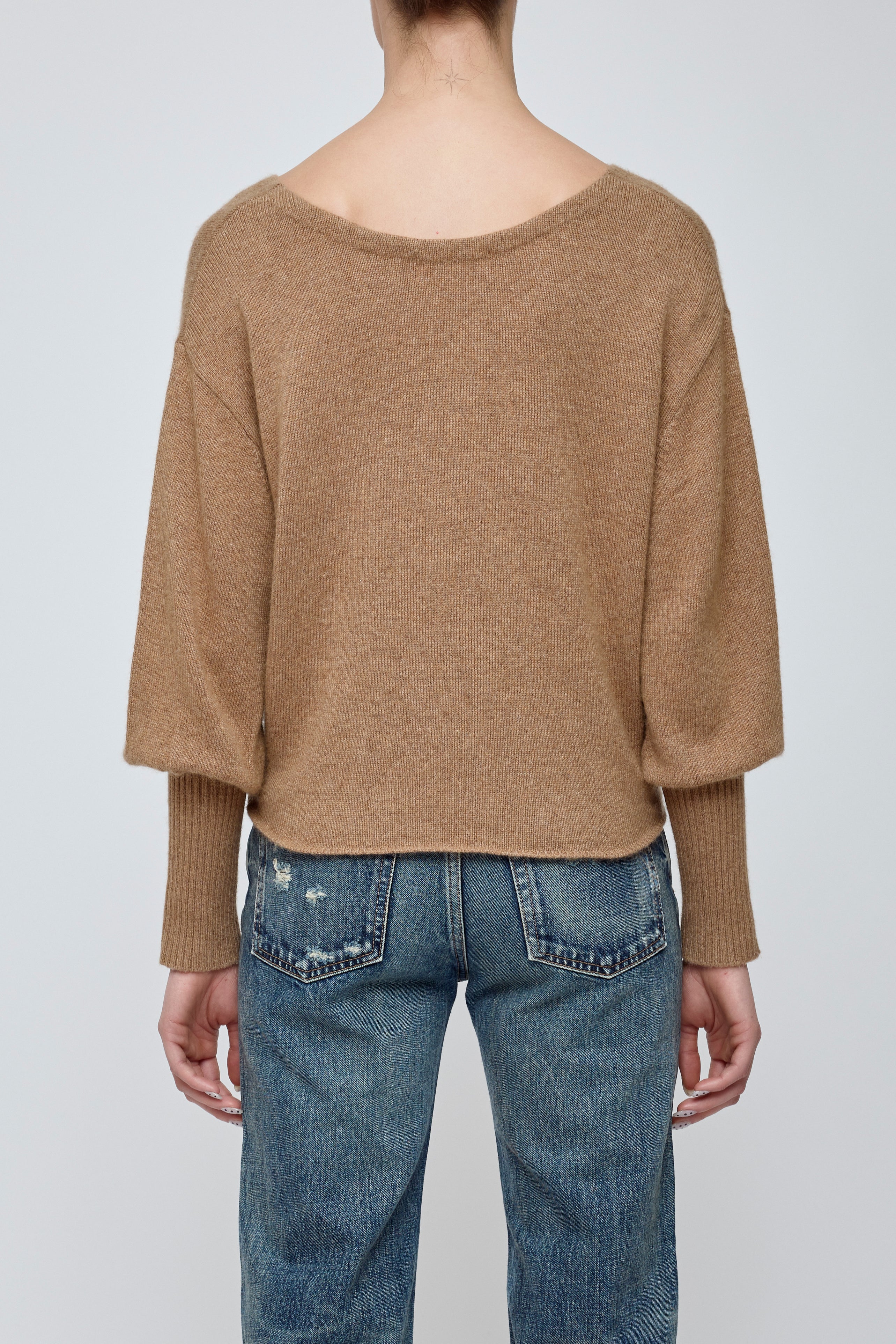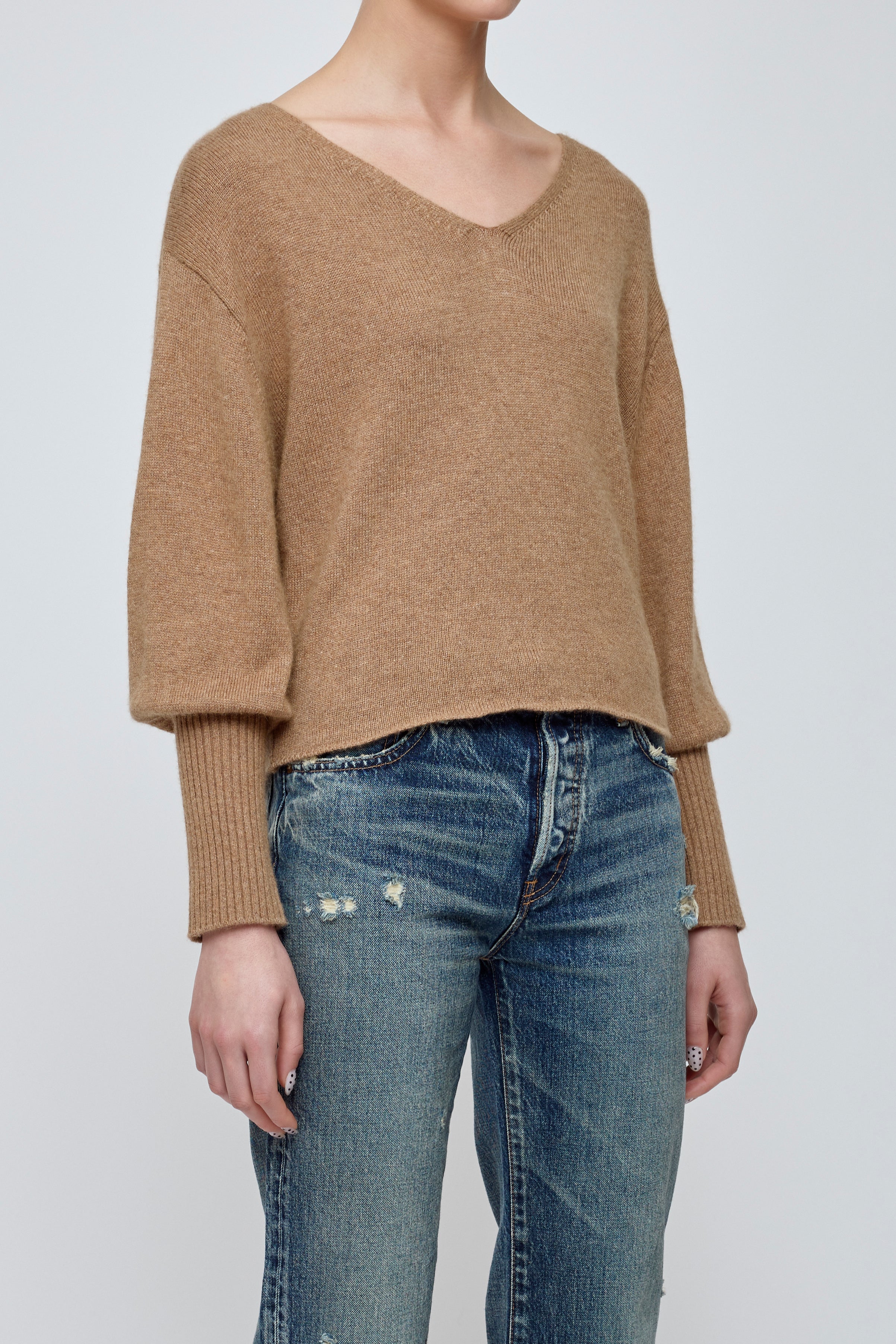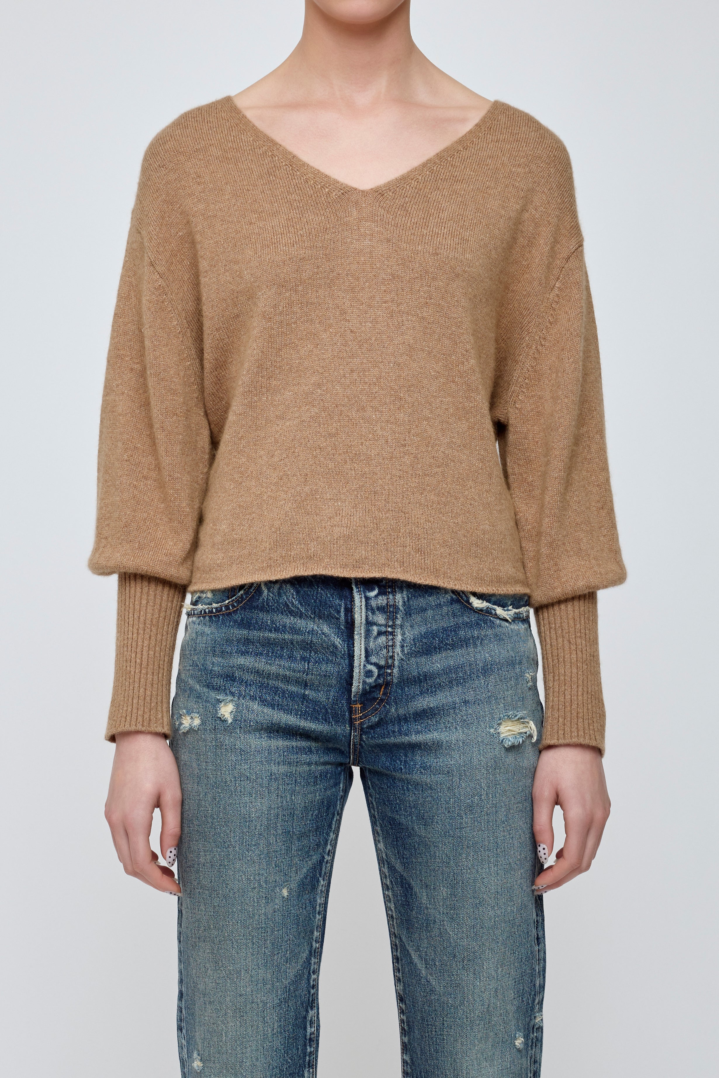 • A soft wool blend knit with an open V-neck and dolman sleeves that taper elegantly, creating a relaxed yet refined silhouette.