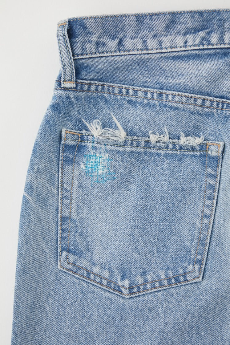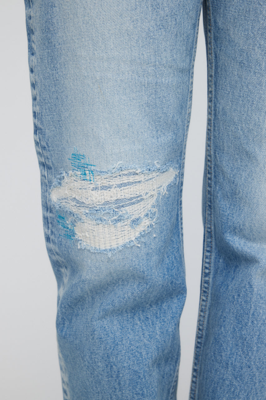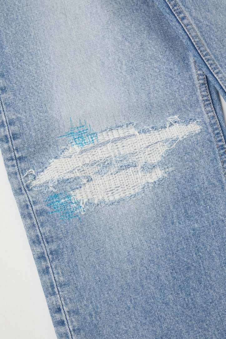 • Hand repair patch detail with bright blue stitches on the right leg