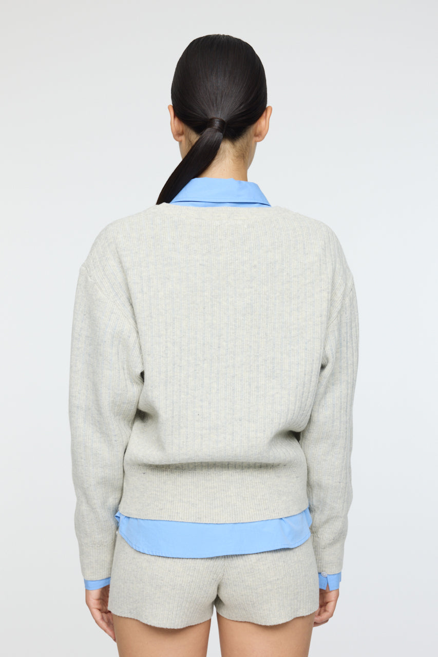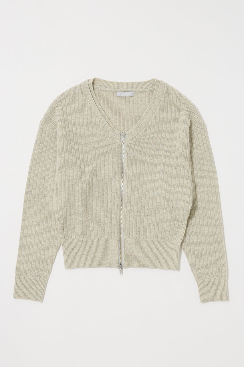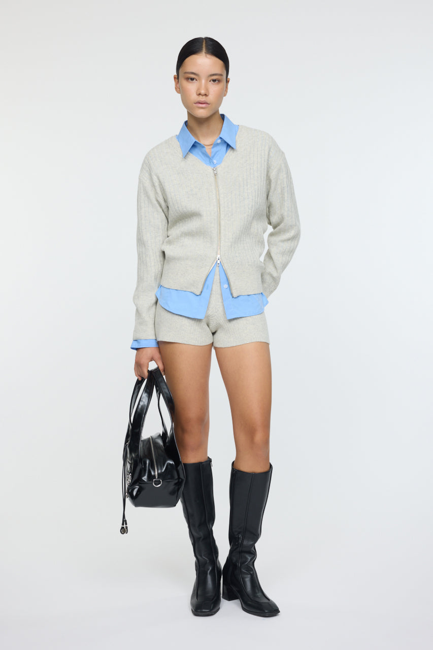 • A knit cardigan with a front zipper design that offers versatile styling options.