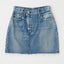 • This denim skirt is a forever classic with a contemporary touch, featuring an asymmetrical button detail, raw hem and a patch pocket on the back.