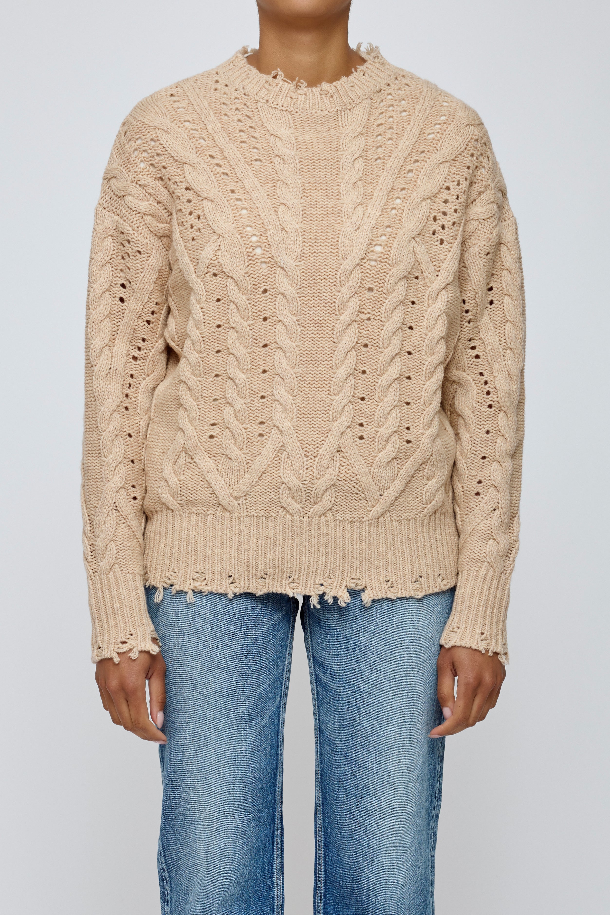 • A modern twist on the classic cable knit, this distressed wool-blend sweater features a wave hem and raw edges for an effortless, lived-in elegance.